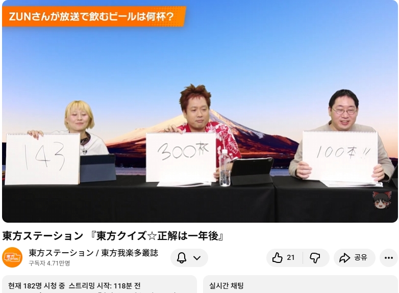 문3. 2025년에 ZUN님이 동방스테이션 방송에서 마신 맥주는 몇잔?