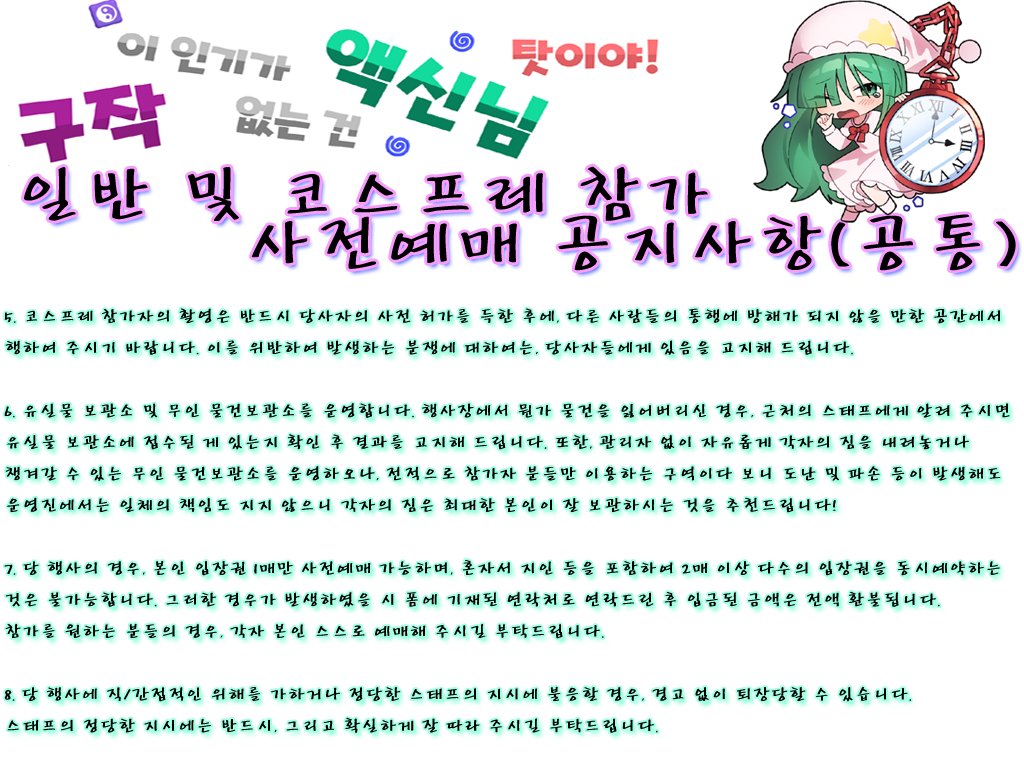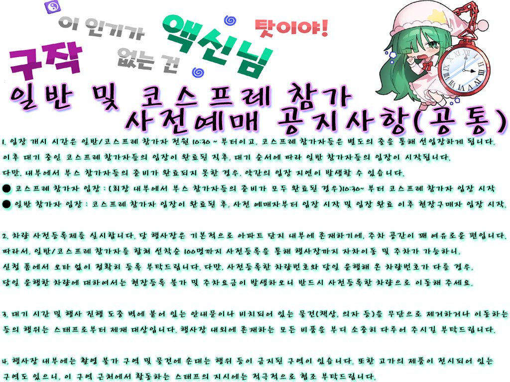 동방프로젝트 구작 5작품과 카기야마 히나 중심의 온리전 '구작이 인기가 없는 건 액신님 탓이야!' (4/4 (토), 서울 그린아트홀) 와 관련하여, 일반 참가자를 대상으로 하는 사전 예매가 개시되었다고 합니다.