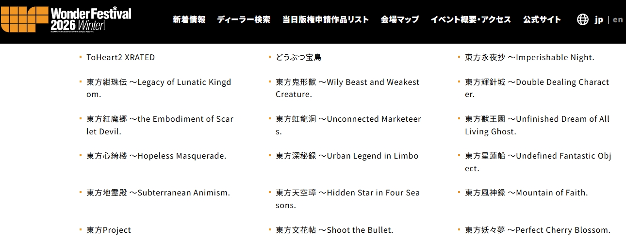 (당일 판권 작품 목록에서 동방프로젝트 및 동방 공식 작품들의 목록을 확인할 수 있습니다.)