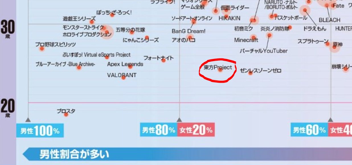 (지난해(2025) 닛케이에서 조사한 내용에서 언급된 주요 작품들의 팬층 분석 내용, 동방은 이 그래프에서 가장 어린 연령대를 가진 작품 중 하나 였습니다. 위의 자료가 실린 곳은 日経エンタ (닛케이 엔터) 25년10월호)
