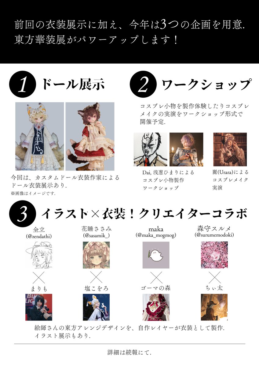 새로운 시도로써 그림작가와의 콜라보 전시, 조현 및 ZUN모자 제작, 코스프레 메이크 등의 워크샵, 인형 의상 전시 등 다채로운 기획을 실시 합니다.