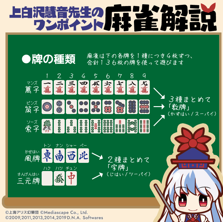 "캐릭터 소개에 맞춰서, 소개문의 마작 용어에 포커스를 맞춘 '원포인트 마작해설' 을 부정기 적으로 끼워넣고자 합니다. 연속으로 올라오는 때도 있을 듯 합니다만, 아무쪼록 부드럽게 잘 부탁드립니다. 우선은 제0회... 라는 것으로 중요한 용구가 되는 '패' 의 종류에 대해"