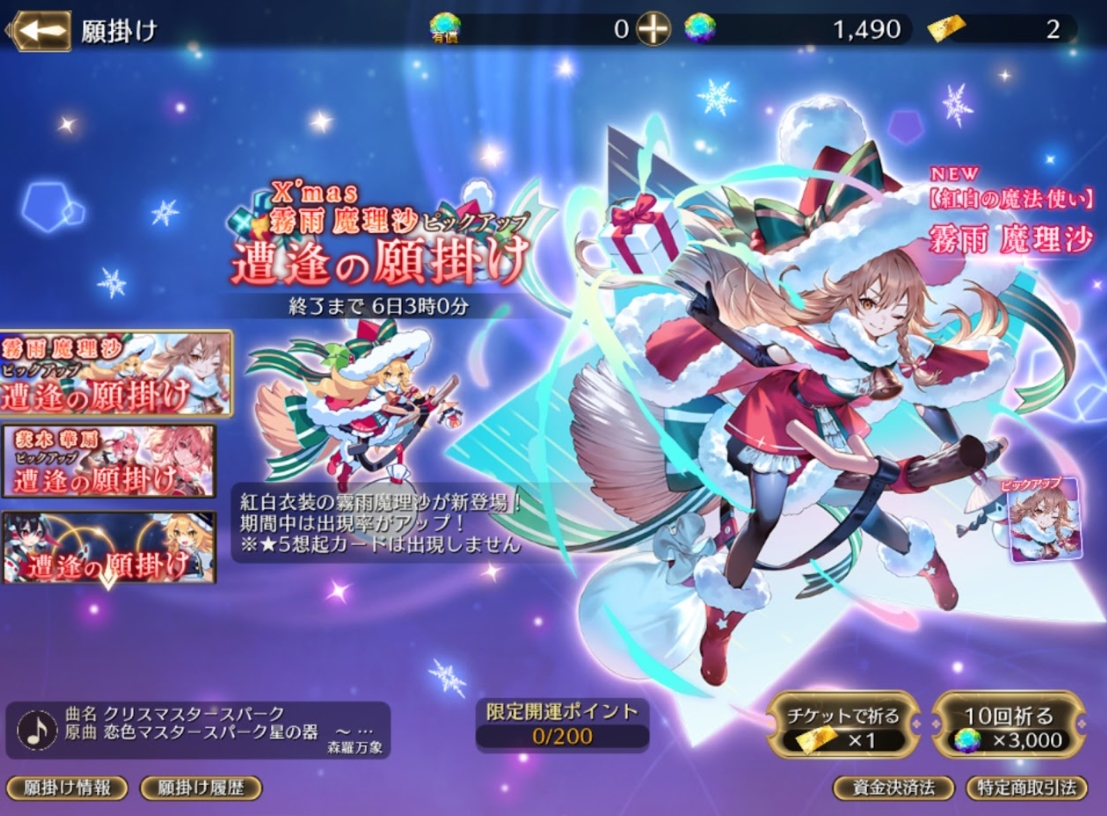 期間限定で開催中の「X'mas霧雨魔理沙ピックアップ遭逢の願掛け」に登場中!ぜひチェックしてみてください! pic.twitter.com/JSeyammc6I