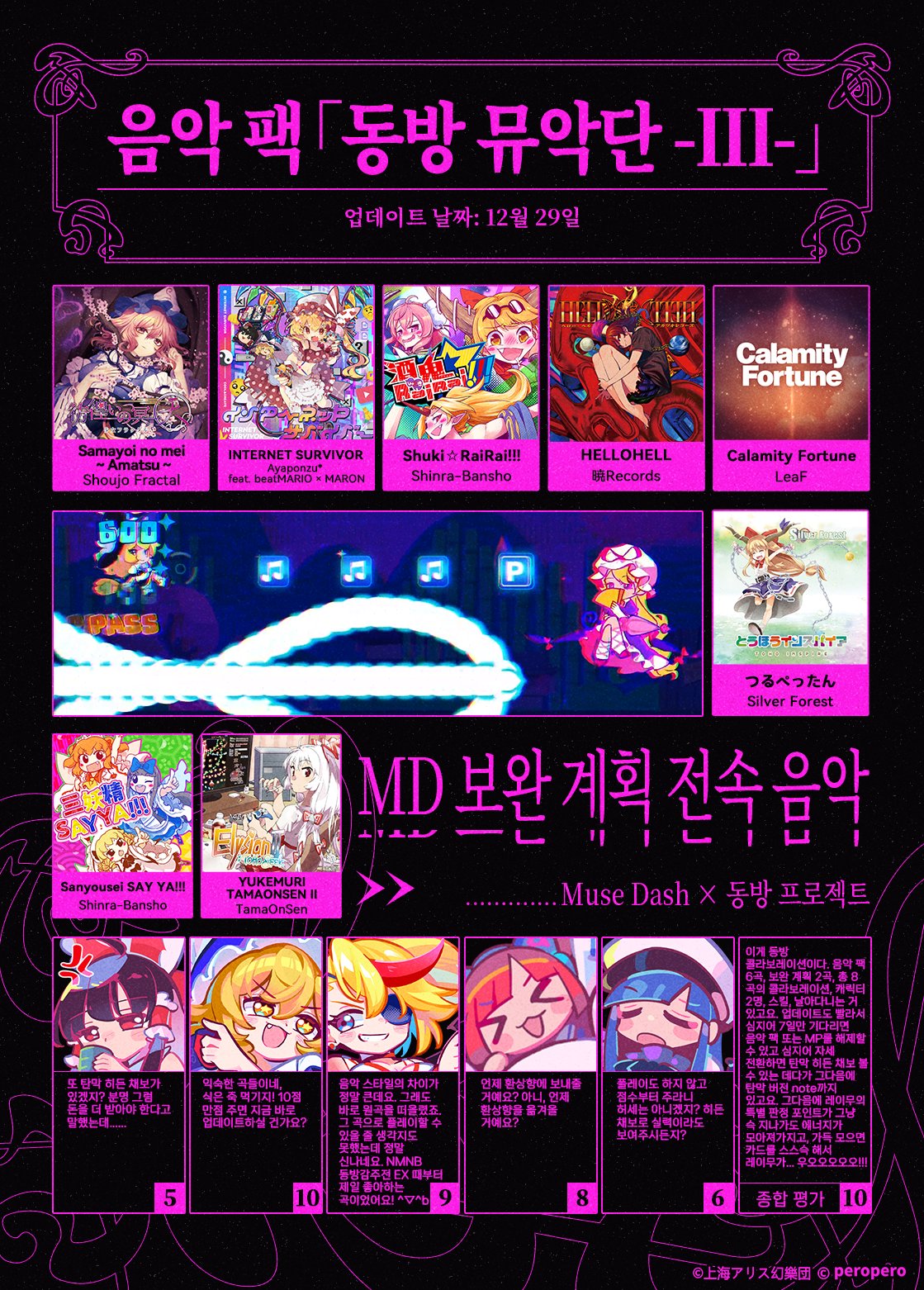 콜라보레이션 음악 팩 「동방 뮤악단 -III-」 음악 공개! 이번에는 심사위원 다섯 분을 초대하여 평가를 진행한 후 플레이하도록 부탁드렸어요. 음악 팩이 심사위원분들께서 기대한 수준으로 만들어졌을까요? 12월 29일 업데이트 후 알게 될 거예요 m9( ・`ω・´) pic.twitter.com/NuWEHVhg6Q