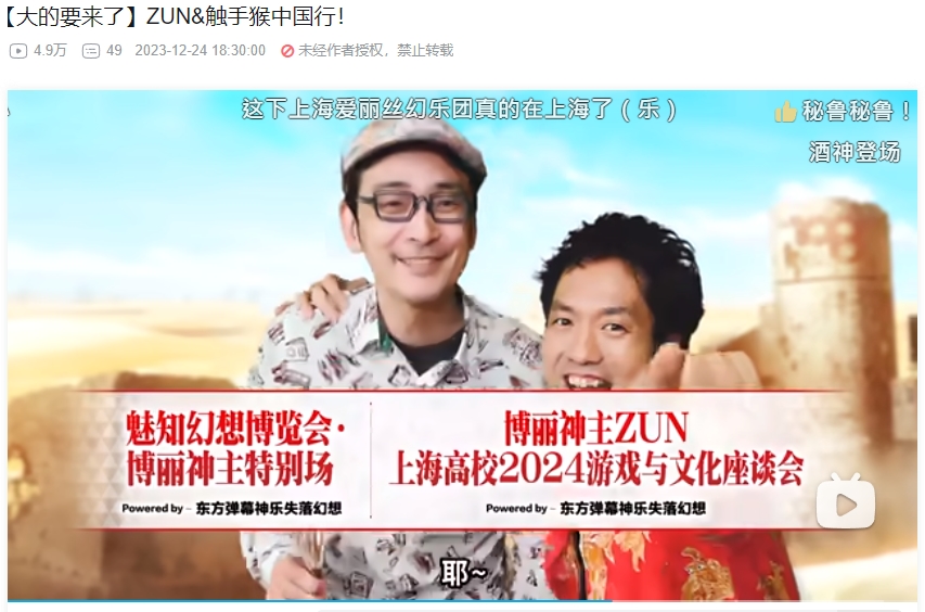 2월 3일에 있을 동방 온리전인 매지환상박람회( 魅知幻想博览会) 과 ZUN님의 방문이 되는 '상하이 고교 2024 게임과 문화 좌담회' 의 안내 및 2월 4일에 마라시님의 라이브도 있다고 안내 되는군요.