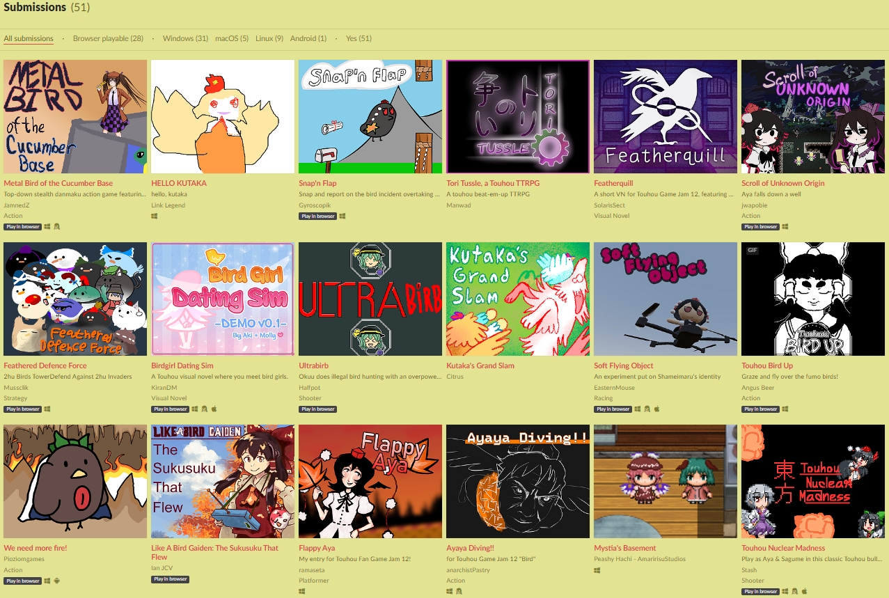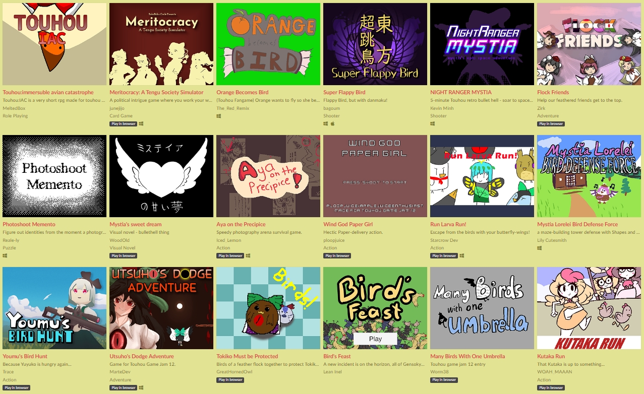 A game jam from 2024-01-04 to 2024-01-27 hosted by Nitori, triplezeta, Vinyis, Kevin Minh & noeticnightjar. Banner by Panchamon The theme for Touhou Fan Game Jam 12 is; Bird Games Showcase the fantastic feathered and flying friends of Gensokyo - whether it