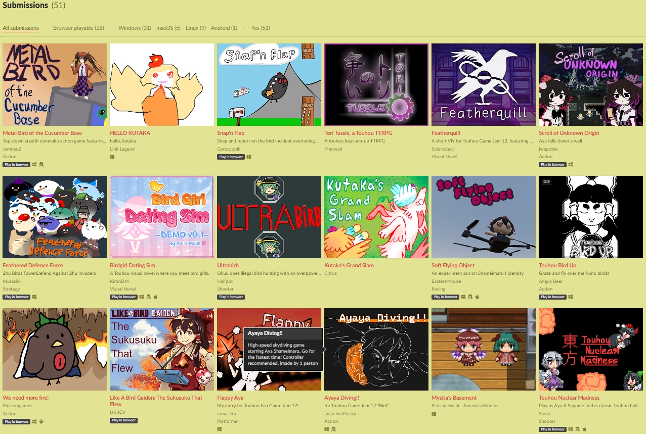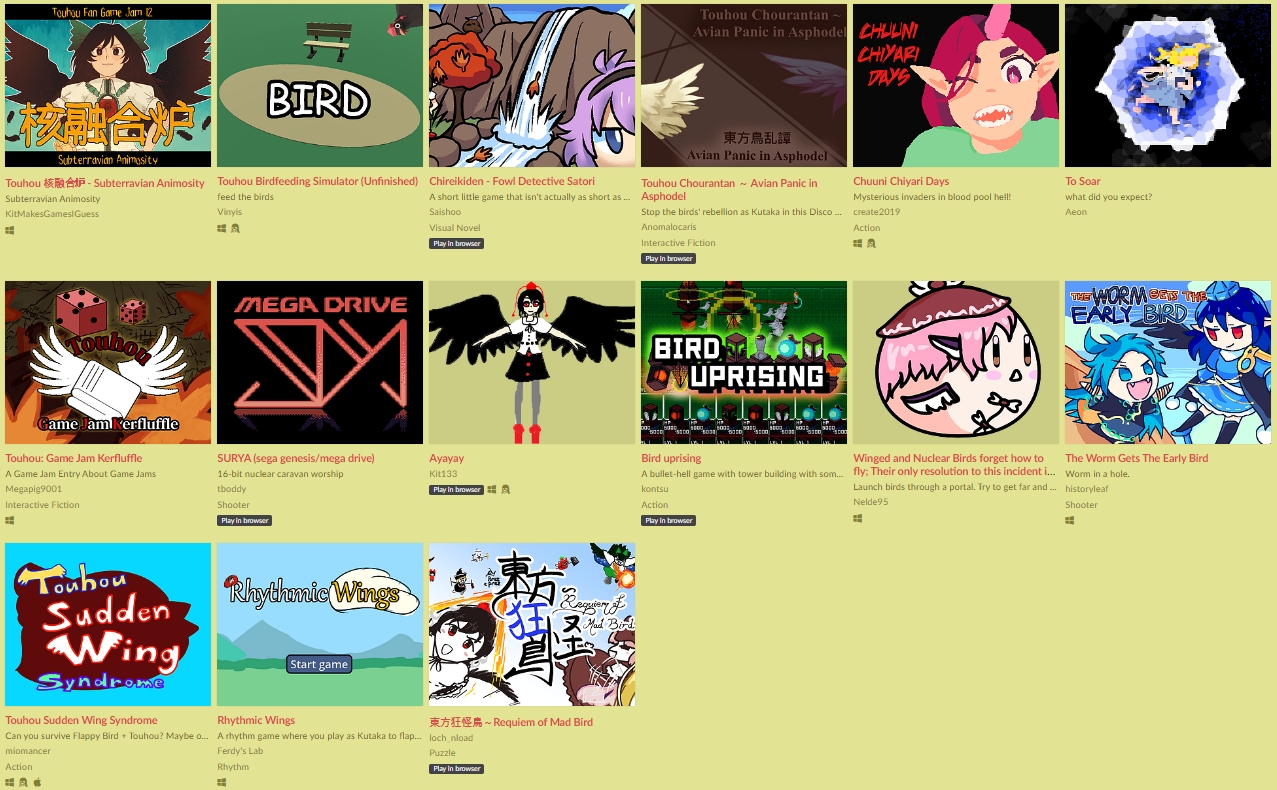 The submission period for Bird #TouhouJam 12 is ending! Because itch appears to be having a very unfortunately timed outage, we are accepting deadline extensions through Twitter also -- feel free to DM us for any help uploading your project if you aren't already in the Discord.