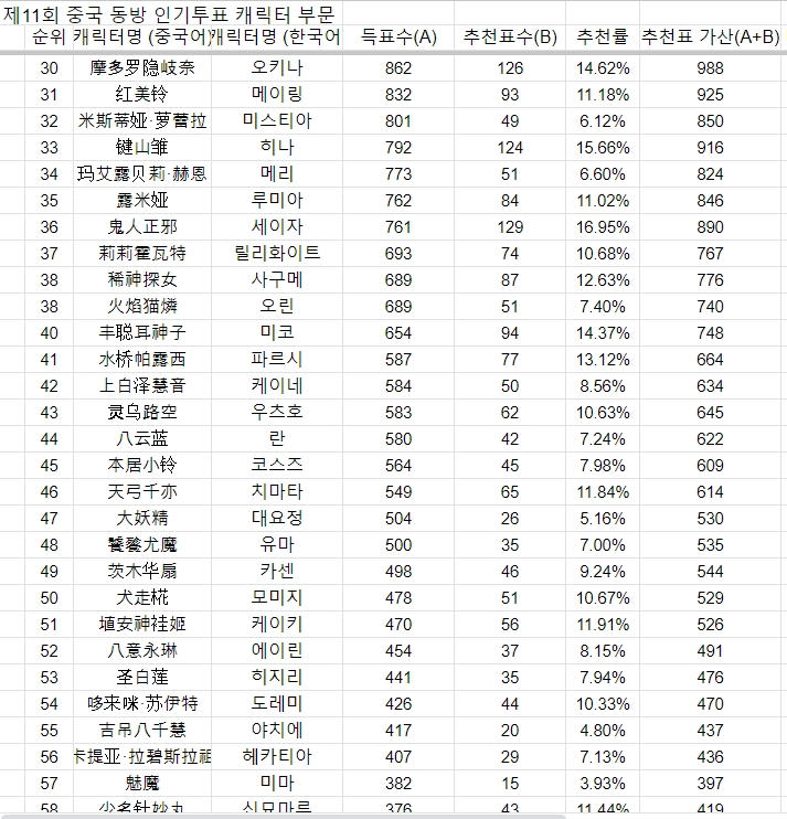 제11회 중국 동방 인기투표 결과