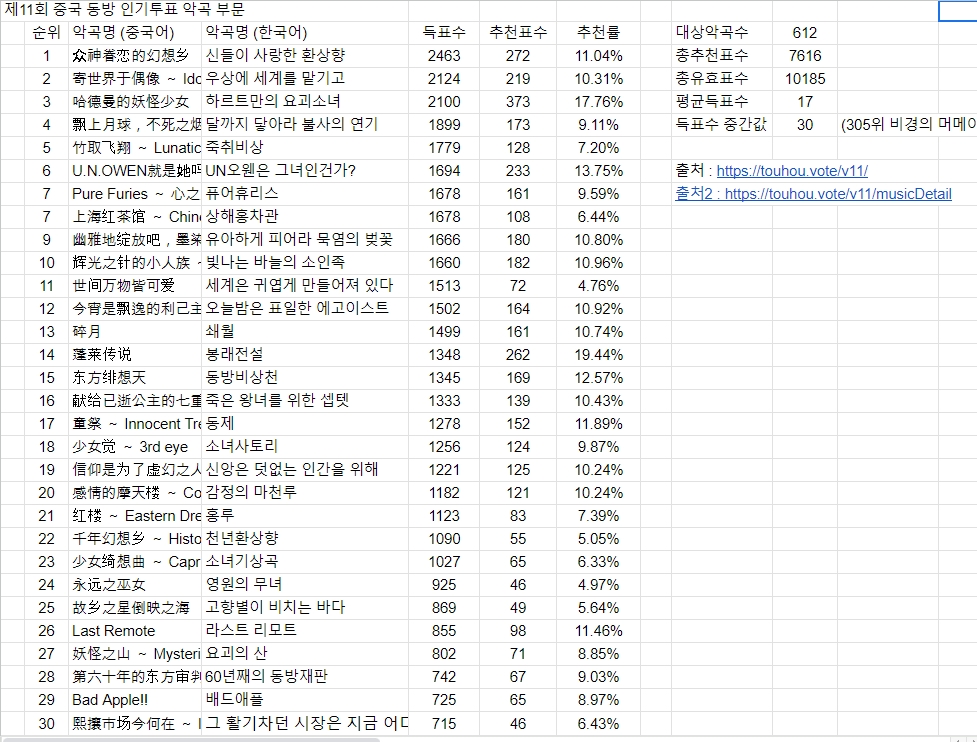 악곡 부문도 중국 쪽은 신들이 사랑한 환상향이 압도하는 느낌입니다.