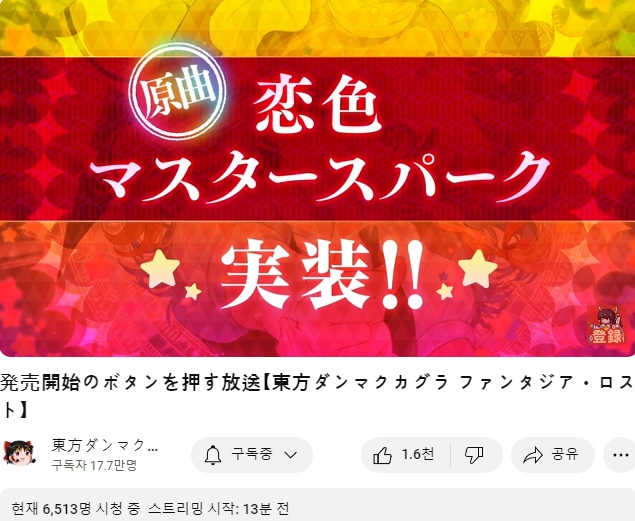 동방 원곡 버전의 사랑빛 마스터 스파크가 실장된다는 내용의 발표