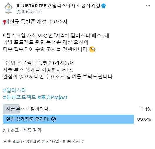 오는 5월 4~5일 양일 개최되는 일러스타 페스에서의 동방 특별존 개설에 대한 설문이 진행중이라