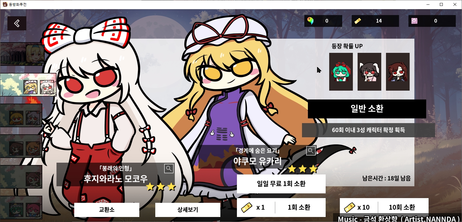 에… 심유경입니다. 안녕하세요?2021년경 나왔던 국산 동방 2차창작 스마트폰용 게임 '동방화투전' 이후로 많은 업데이트를 거치며 게임의 갱신이 계속 이뤄지고 있었는데,최근 이 작품이 스팀