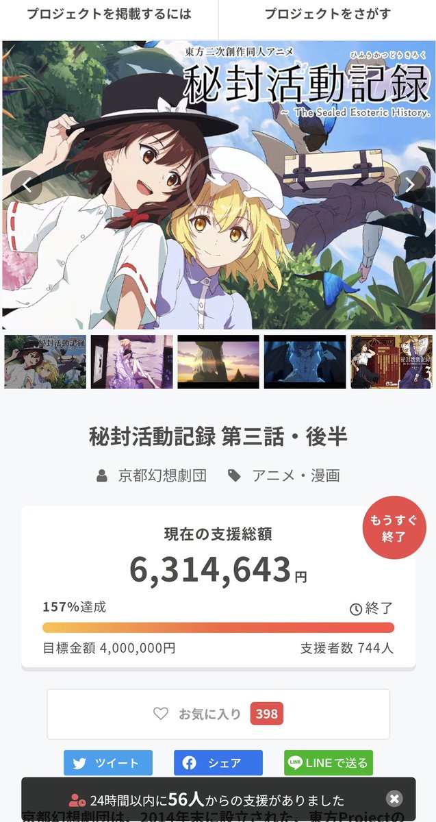 서클 교토환상극단(京都幻想劇団 / 京都幻想剧团) 에서 제작하는 동방 2차창작 애니메이션 시리즈인 비봉활동기록과 관련하여, 현재 제작중인 운명 중/후편 (3편의 중편과 후편) 제작을 위한 펀딩이 마무리 되었다는 소식입니다.