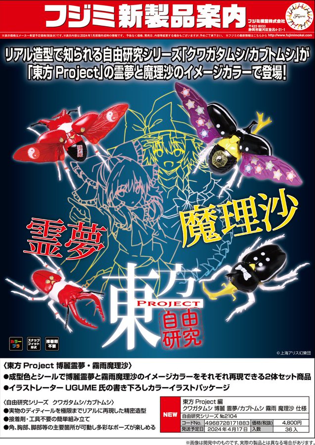 リアル造型で知られる自由研究シリーズ「クワガタムシ/カブトムシ」が「東方Project」の霊夢と魔理沙のイメージカラーで登場!#フジミ模型 pic.twitter.com/Fm4FgXpOle
