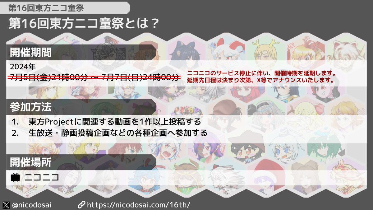 현재 니코니코의 서비스가 정지됨에 따라, 올해의 개최 시기를 연기합니다. #nicodosai