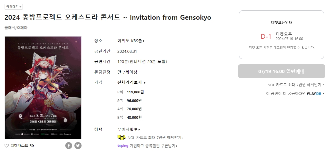 | 2024 동방프로젝트 오케스트라 콘서트의 티켓 예매 개시까지 D-3, 예매 안내 등이 공개 (1) | 2024.07.16 |