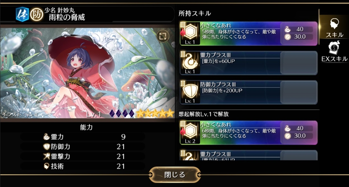 身体が小さくなり、被弾しにくくなる「小さくなあれ」は、想起解放+4でEXスキルとなります。