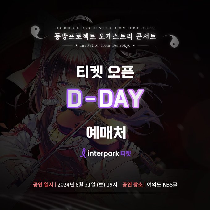 7월 19일 오늘 16시부터 2024 동방프로젝트 오케스트라 콘서트(8/31 개최 예정) 의 티켓 예매가 개시되었습니다.