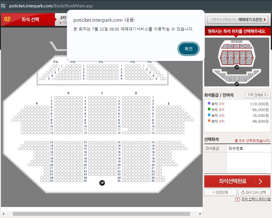 처음에 미리 봐두었던 좌석을 눌러보니 선점되어 있다는 안내가 떠서 새로고침하고 다른 좌석을 하려하니 이미 매진에 가까운 상태군요;