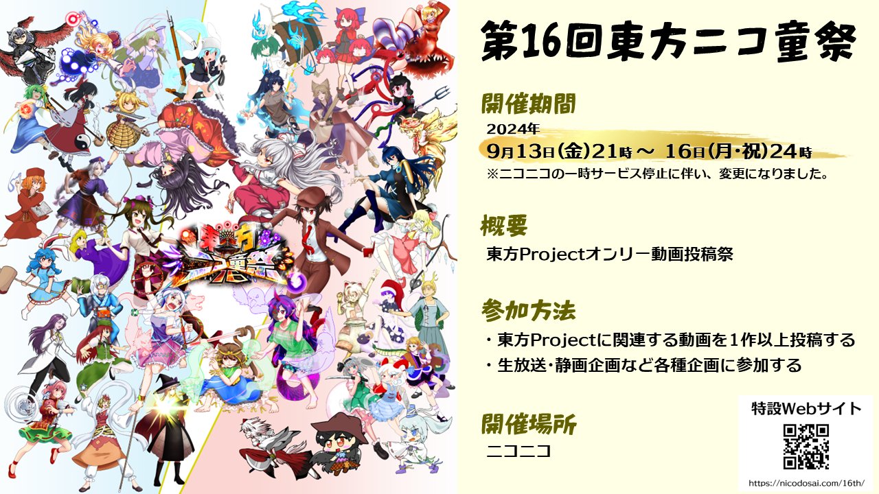 第16回東方ニコ童祭の延期先の開催日を「9月13日(金)21時~16日(月・祝)24時」に決定しました!