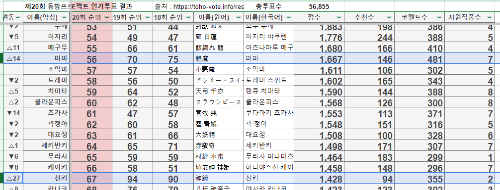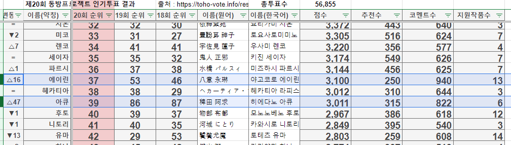 그리고 히사미의 경우도 여성표가 비중이 큰 픽으로 꼽혔는데, 신령묘 친구들은 항례대로 였습니다만 히사미 (+잔무) 도 여성팬층에 새로 떠오르는 픽이 되는 것 같습니다.