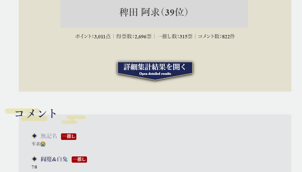 이번은 처음부터 상세결과가 발표되었기 때문에 항목별로 눌러 상세한 데이터와 투고 코멘트를 확인하실 수 있습니다.