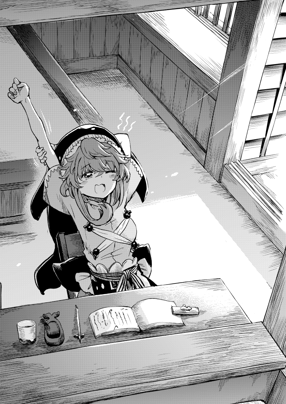 밤새워 장부 작업을 한 것 같아보이는 미요이의 모습입니다.