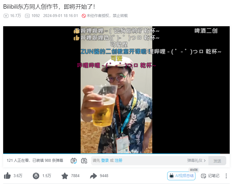 그리고 2024년 9월 1일인 어제, ZUN님으로부터 비리비리에서의 동방 동인 창작 이벤트에 대한 안내 및 관련 영상을 게시한 것을 볼 수 있었습니다.