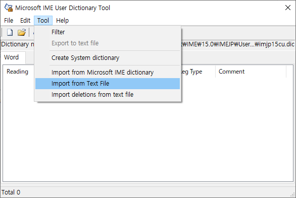 도구에서 텍스트 파일로 불러오기 항목을 통해 서클에서 만든 사전용 txt 파일을 불러올 수 있습니다.