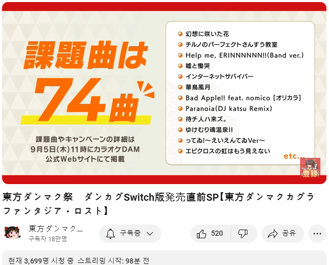 | 동영상 사이트 비리비리에서 동방 동인창작 이벤트를 실시, ZUN님의 안내 영상도 (1) | 2024.09.02 |