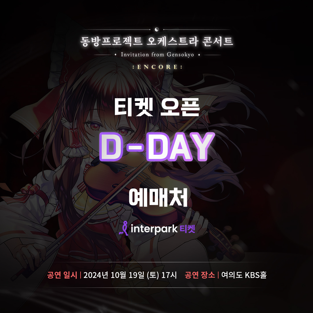 | 2024 동방프로젝트 오케스트라 콘서트 앵콜 공연의 티켓 예매 오픈 일정이 안내(9/19) (3) | 2024.09.13 |