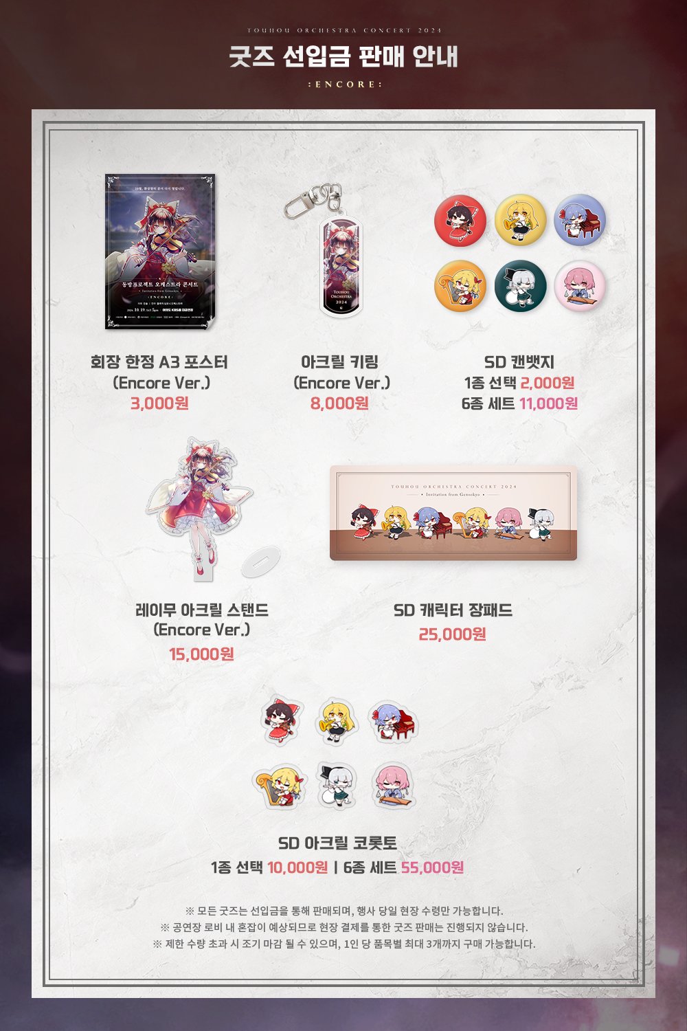 2024 동방프로젝트 오케스트라 앵콜 기념 굿즈의 판매가 오늘 19시부터 바로 진행됩니다! 1차 공연 굿즈 일부와, 신규 굿즈들을 만나보실 수 있습니다✨