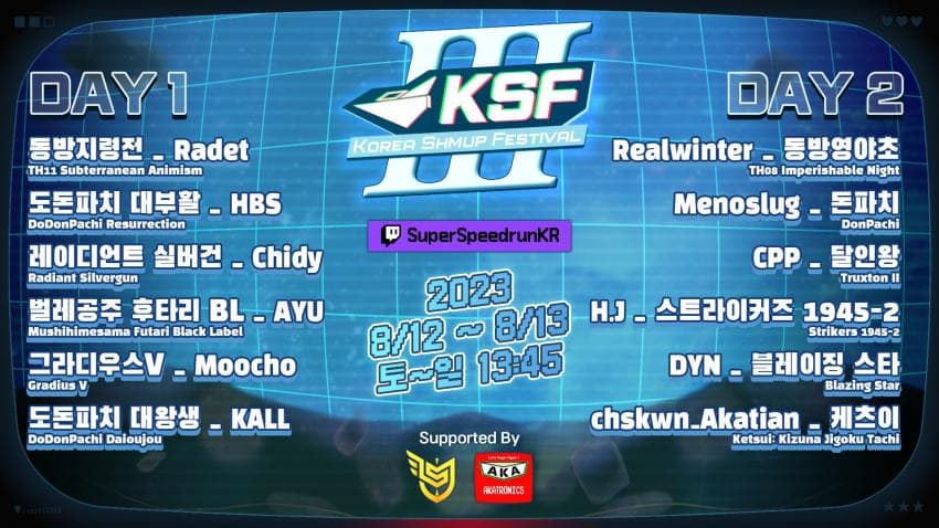 (위 페이지에서 인용)한국 슈팅게임 페스티벌 KSF가 올해에도 개최됩니다!본 행사는 한국 스피드런 이벤트 팀 (@superspeedrun)의 서포트를 받아 진행됩니다.동방 프로젝트는 이번에도 양일에 모두 배정되어 있으며 가장 먼저 여러분들을 찾아뵙게 되었습니다.저는 EBM 님과 함께 해설로 참여하며 Radet님의 동방지령전과 S유한성2님의 동방영야초 퍼펙트 플레이 도전을 기대해 주시기 바랍니다.이외에도 각종 흥미진진한 슈팅 게임들과 무시무시한 실력을 가진 러너분들의 화려한 플레이를 라이브로 감상하실 수 있으니 많은 시청 부탁드리겠습니다.감사합니다.