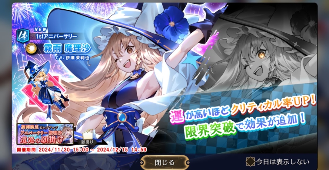 開催中の「期間限定 アニバーサリー魔理沙 ピックアップ 遭逢の願掛け」で登場します!