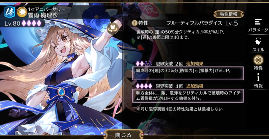 특성으로 편성시 운 스탯이의 50% 만큼 크리티컬을 올리고 (최대 돌파시) 최대 40까지 올라간다고 되어 있군요.