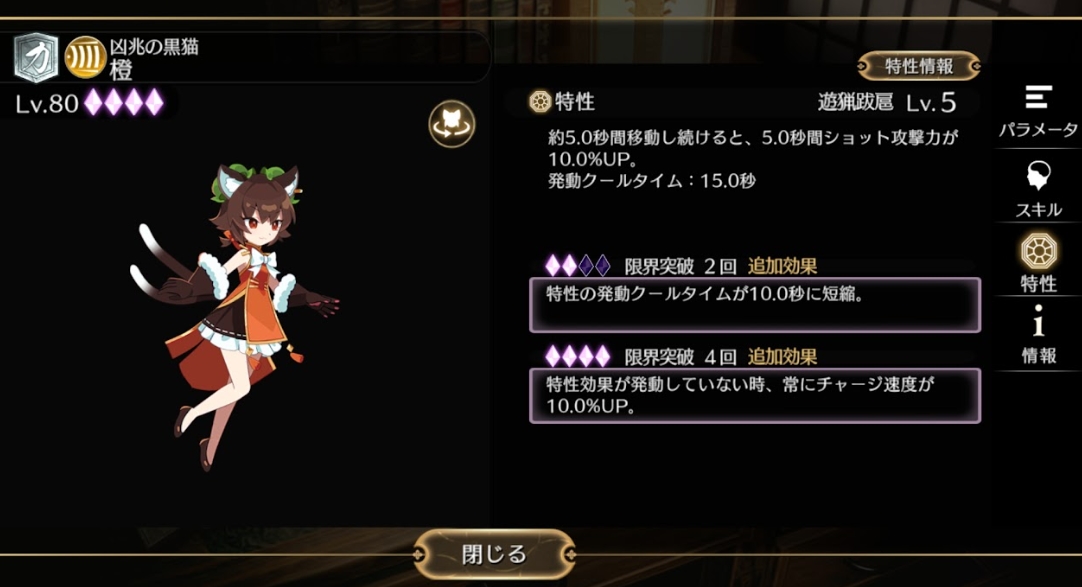 アイテムを吸収するオブジェクト(スキマ)を設置するスキル『集積の境界』を持っており、スキマが吸収する[ポイント]系アイテムは倍率が50%UPします。
