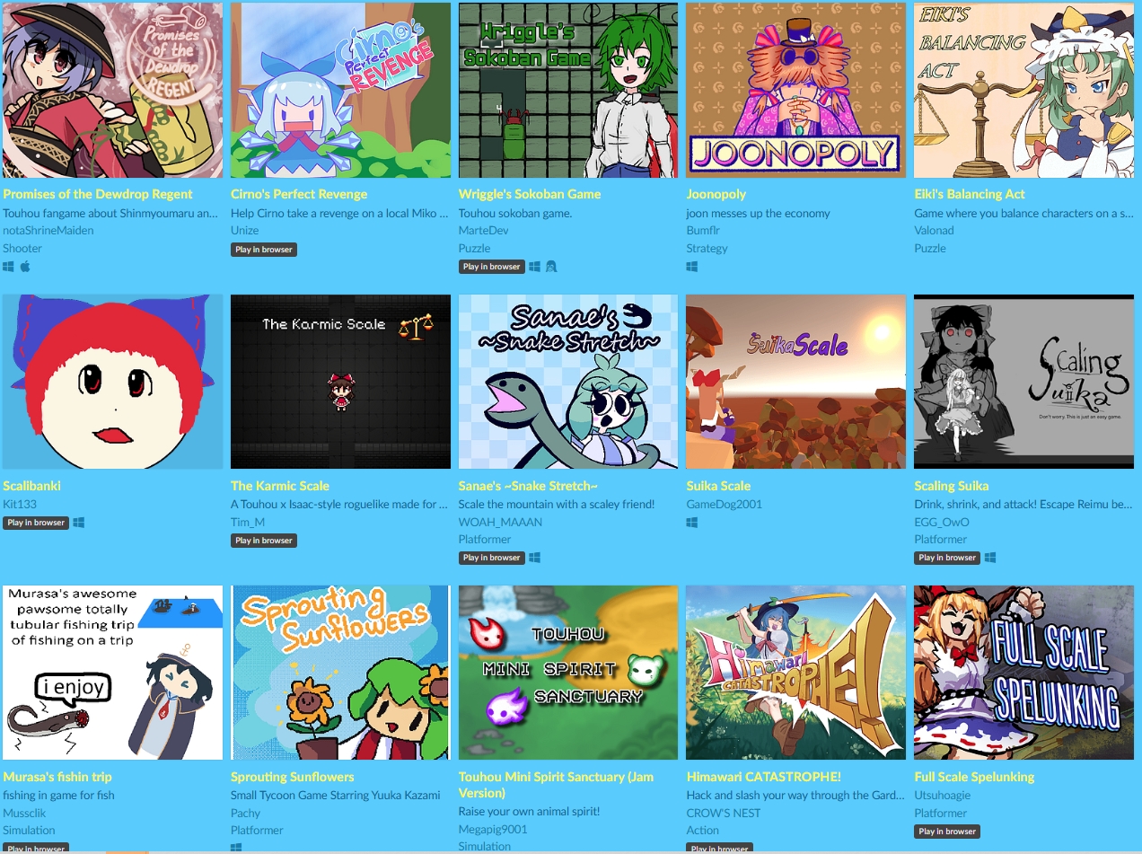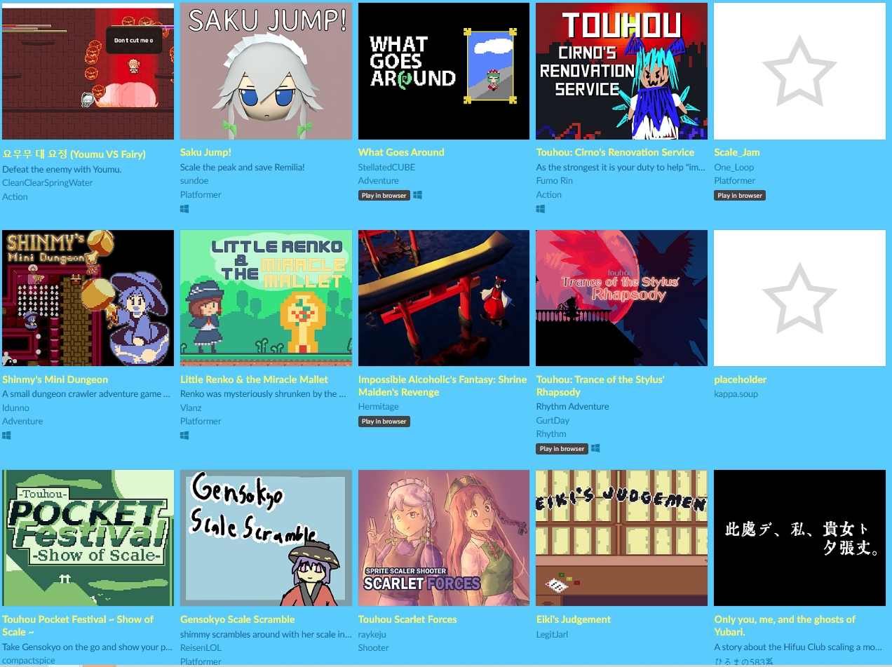 스케일이라는 주제로 제작되어 등록된 64개의 동방 2차창작게임 작품 중 웹상에서 바로 플레이 가능한 작품이 서른개, 윈도우에서 플레이 가능한 작품이 약 38종 이었습니다.
