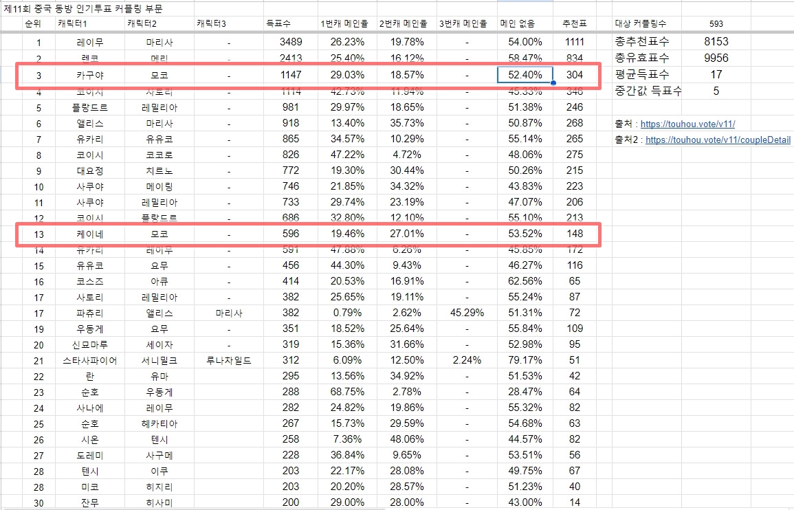 여기서도 모코를 두고 카구야파와 케이네파가 다 순위권인 것을 볼 수 있었지요...