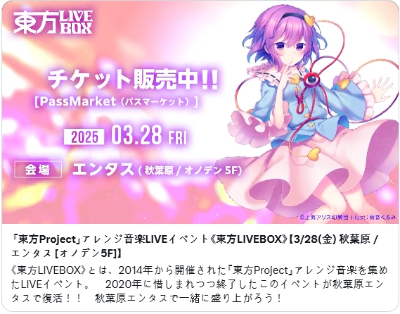 오는 3월 23일(일) 개최 예정인 동방프로젝트 어레인지 음악 라이브 이벤트 '동방 라이브 박스' 와 관련하여