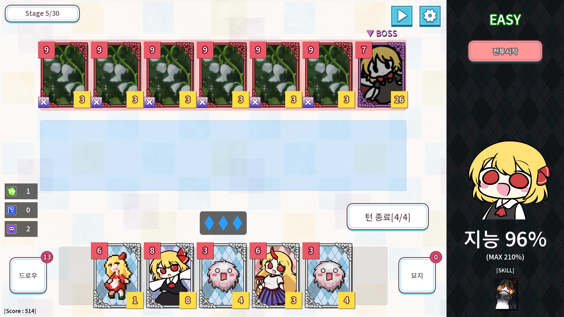 위쪽에 셋업된 적의 덱을 다 물리치면 (못 물리치면 그만큼 지능 다운) 다음 스테이지로 넘어가는 방식이었습니다.