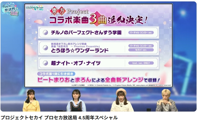 작년 3월경에 모바일 리듬게임 '프로젝트 세카이 (프로젝트 세카이 컬러풀 스테이지! feat.하츠네 미쿠 プロジェクトセカイ カラフルステージ! feat.初音ミク)' 쪽으로 동방프로젝트 악곡 콜라보가 실시되어 배드애플과 헬프미에링 등 3곡이 추가된 적 있었는데, 올해 콜라보 2탄이 준비되어 있는 모양이었습니다.