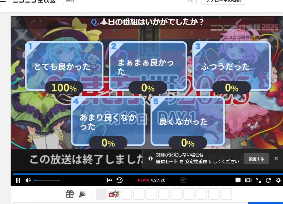니코동에서의 방송 종료 후 앙케이트 결과 (매우 좋았다 100%)