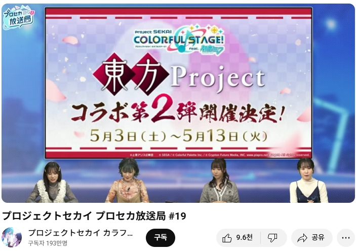앞서 지난 3월말경에 프로젝트 세카이 쪽으로 동방프로젝트 콜라보 2탄이 준비되어, 오는 5/3 ~ 5/13 일정으로 열릴 예정이라는 정보는 전해드린 바 있었습니다.