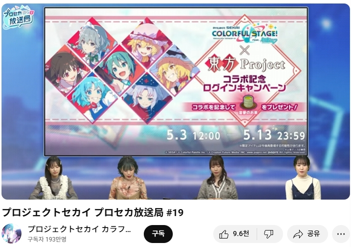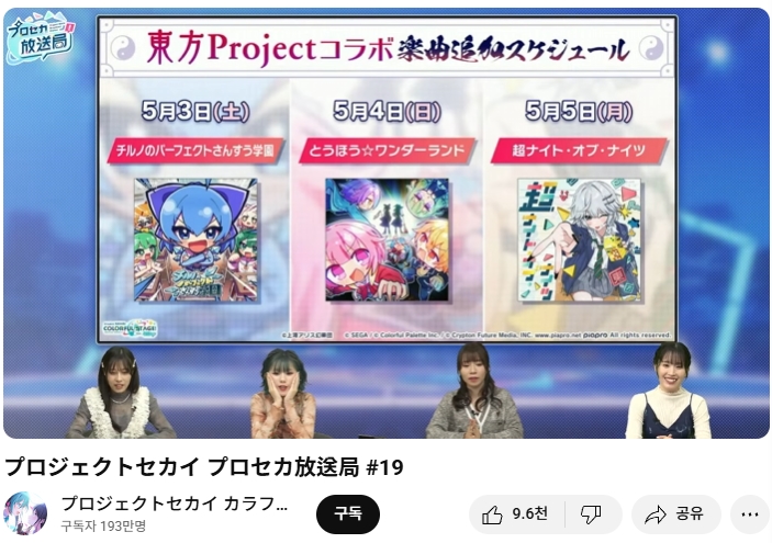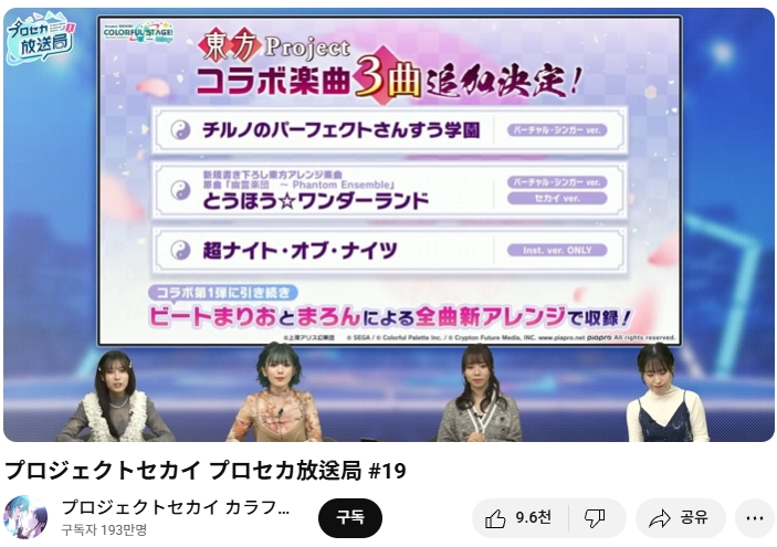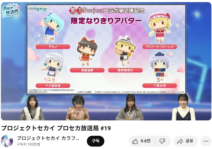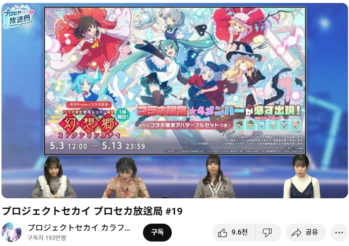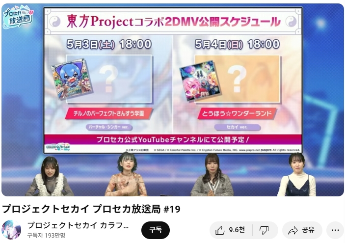 모바일 리듬게임 '프로젝트 세카이' 쪽으로 동방프로젝트 콜라보 제2탄이 실시 예정