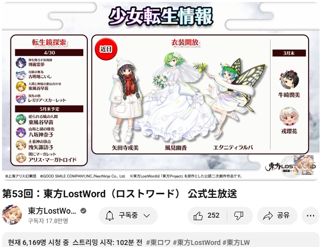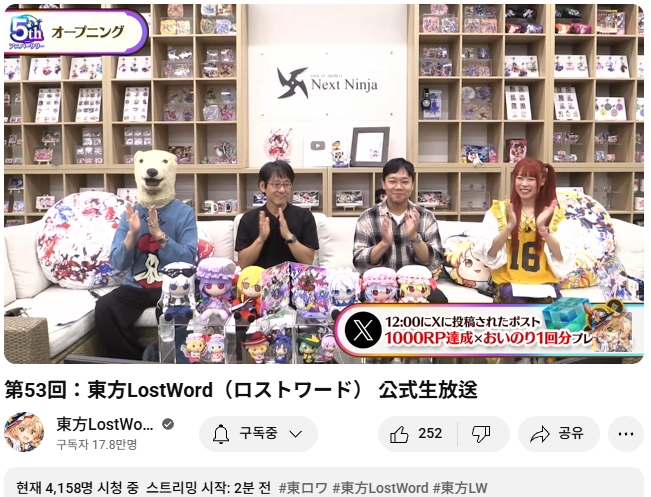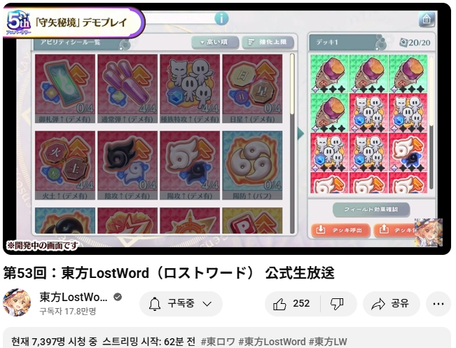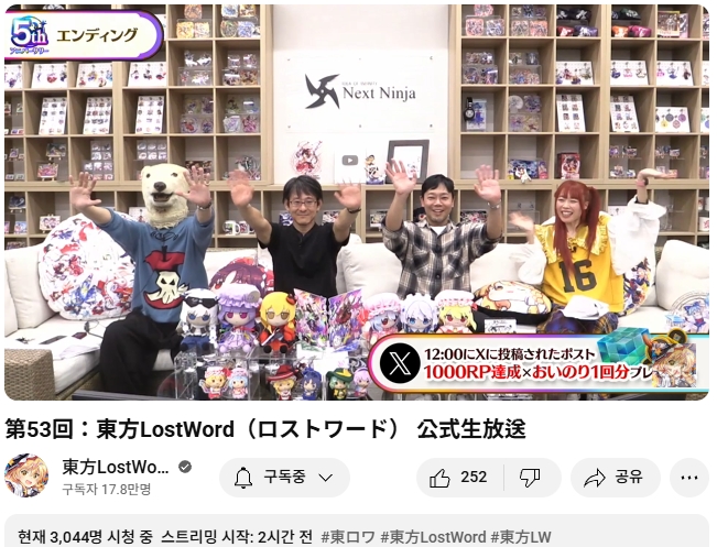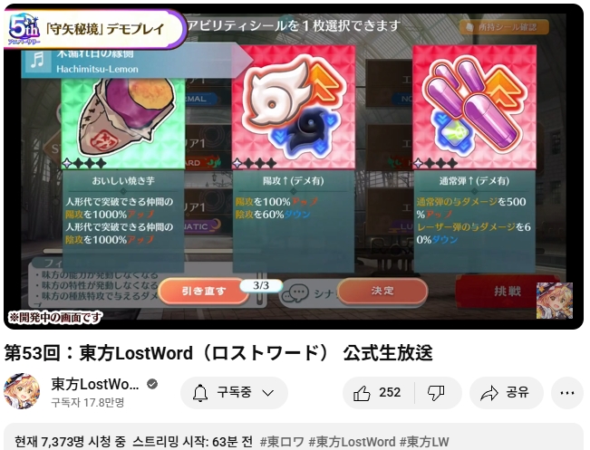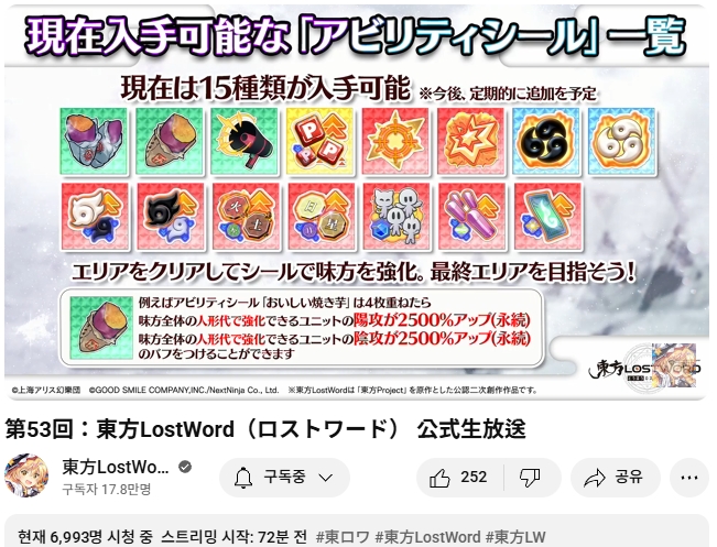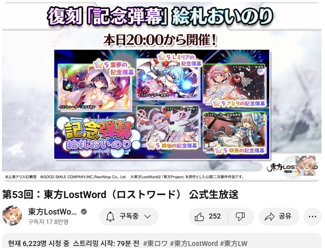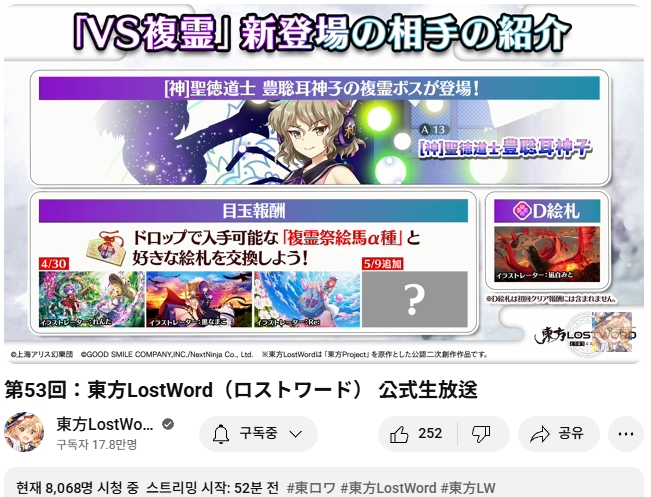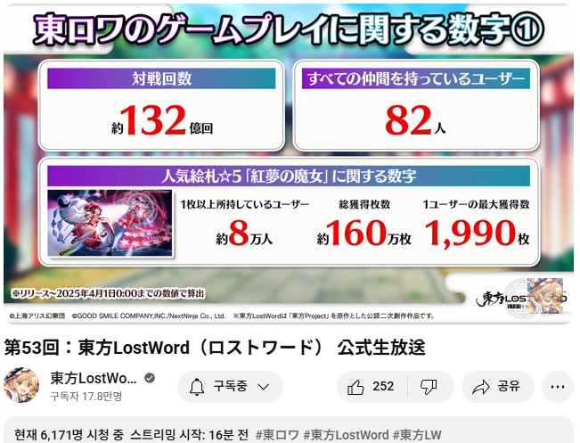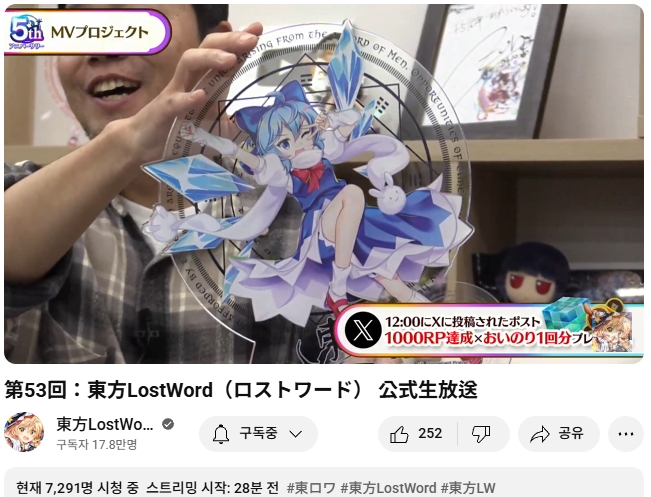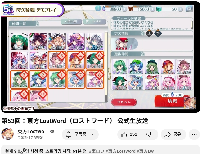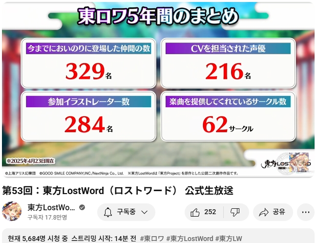 그동안 합류한 동료 캐릭터의 수가 329명, 목소리로 참여한 분이 216명, 일러스트로 참여한 분이 284명, 악곡으로 참여한 서클이 총 62 서클이라고 하는군요.