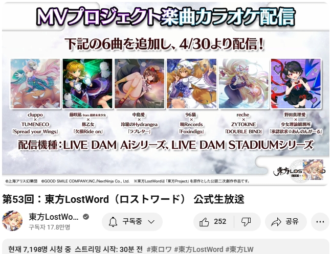 이전에 나온 로스트워드 MV 프로젝트 악곡들의 노래방 추가 정보도 있었습니다.