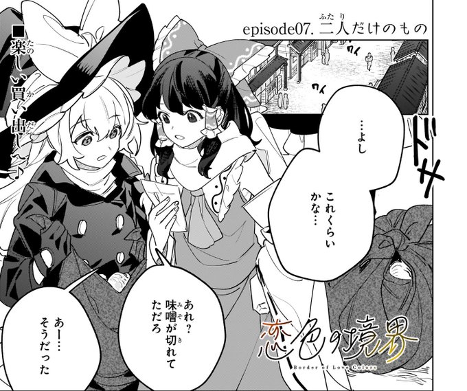 (외래위편 측의 안내) "사랑빛의 경계 제7화, 마을에 물건을 사러 간 두 사람이 한 요괴의 고민 상담에 휘말리는 내용입니다. 단행본 제1권도 호평 발매중♪"
