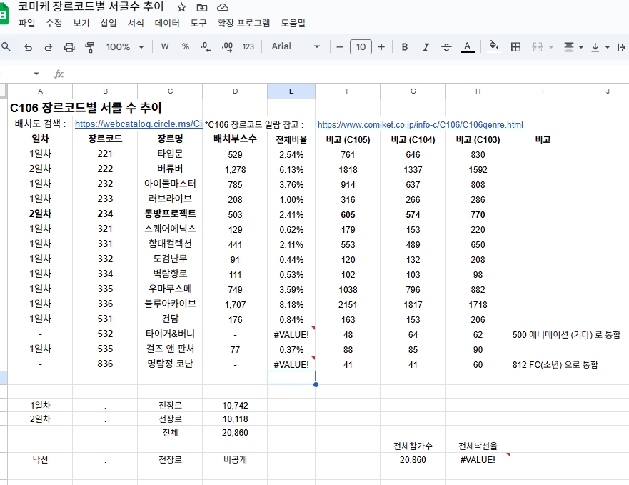 평소대로 웹카탈로그 상으로 각 서클들이 신청한 장르코드 수를 검색하여 변동 수이를 확인해보면...