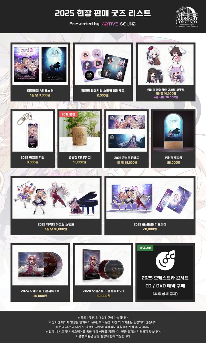드디어 공연일이 하루 남았습니다. 내일 (8/23 토) 개최 예정인 2025 동방 오케스트라 콘서트 'Invitation from Gensokyo 2025 ~ Midnight Concerto' 와 관련하여, 현장에서 당일날 판매될 굿즈 정보와 이번 공연의 CD, DVD 예약 정보가 안내되었습니다.