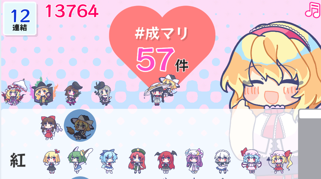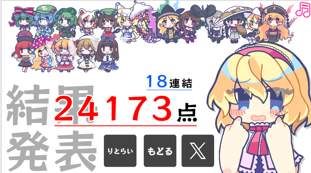 이 작품은 당시 게임잼의 주제였던 '연결' 을 소재로 동방 2차창작 조합 및 pixiv 동방 태그수와의 연계로 점수를 내는 방식이 특이한 연쇄 게임이었습니다.